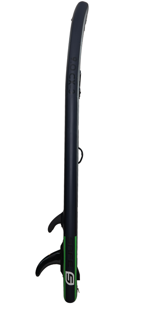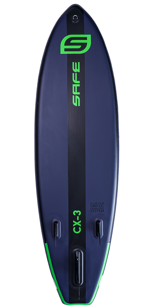 CX-3 9′ is the sup inflatable board ideal for for waves, excursions, travels and free time. It is the perfect mix between fun and sport. This sup board was designed in cooperation with Alessandro Onofri, a many times Italian SUP champion – this means that CX-2 9′ is the best sup inflatable board if you want to ride waves! The “truster” system on the fins (a big, resistant and movable central fin and two small removable side fins) and its 274 cm length make this sup board excellent not only to ride waves – moreover, its width provides the sup board with great stability, ideal to surf or paddle on flat waters. Another characteristic of this sup board is represented by its remarkable rigidity, which makes it perfect for different occasions.